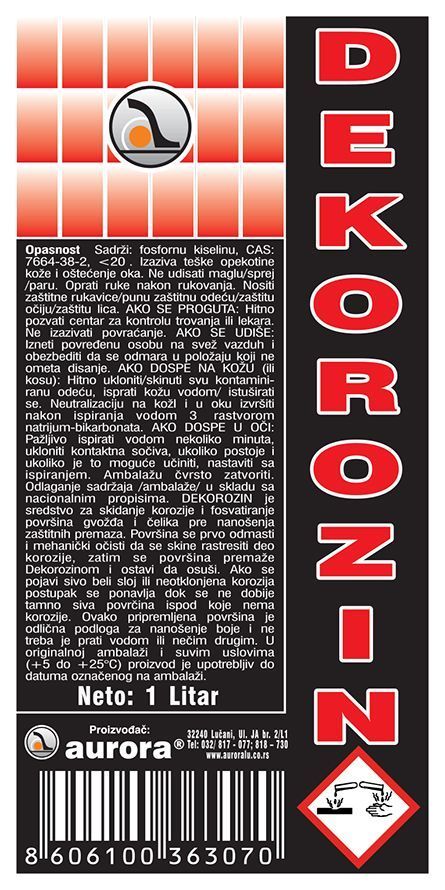 Namena i upotreba: Površina se prvo odmasti (Odmašćivač B) i mehanički očisti da se skine rastresiti deo korozije, zatim se površina premaže Dekorozinom i ostavi da osuši. Ako se pojavi sivo beli sloj ili neotklonjena korozija postupak se ponavlja dok se ne dobije tamno siva površina ispod koje nema korozije. Ovako pripremljena površina je odlična podloga za nanošenje boje i ne treba je prati vodom ili nečim drugim.