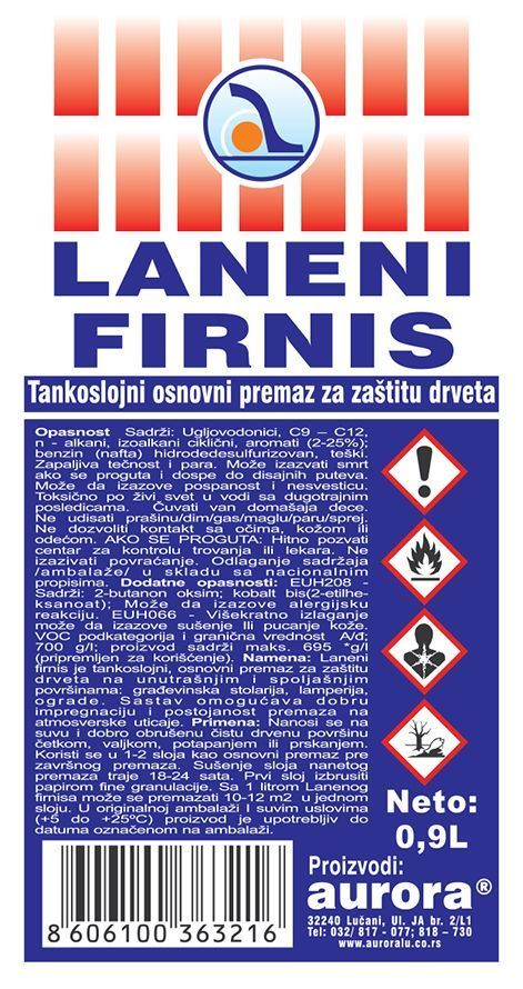 Laneni firnis je tankoslojni, osnovni premaz za zaštitu drveta na unutrašnjim i spoljašnjim površinama: građevinska stolarija, lamperija, ograde. Sastav omogućava dobru impregnaciju i postojanost premaza na atmosferske uticaje.