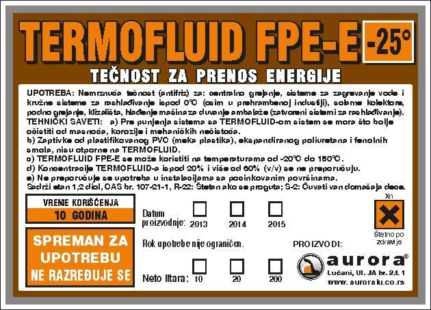 Osobine i namena: Luterm® termofluid FPE-E/-25ºC je koncipiran kao najbolje rešenje tako da u sistemima grejanja i hlađenja obezbedi zaštitu od: zamrzavanja, stvaranja kamenca, korozije, kavitacije i penušanja.