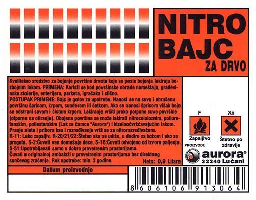Osobine i upotreba: Bajc je gotov za upotrebu za osnovno transparetno bojenje površina od masivnog drveta i furnirnih ploča (u enterijeru za nameštaj, stolariju, parket i sl.) koje se posle bojenja lakiraju bezbojnim lakom. Nanosi se na suvu i obrušenu površinu špricom, krpom, sunđerom ili četkom. Ujednačeno isticanje strukture drveta i brzo sušenje glavne su karakteristike Nitro bajca. Regulisanjem inteziteta nijanse i pranje pribora za bojenje vrši se BS Nito razređivačem Aurora Lučani.