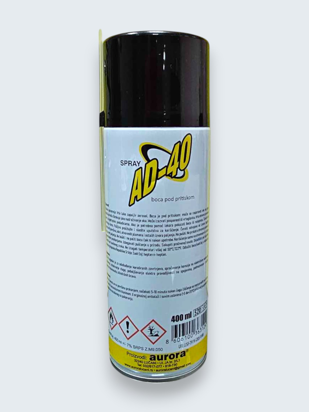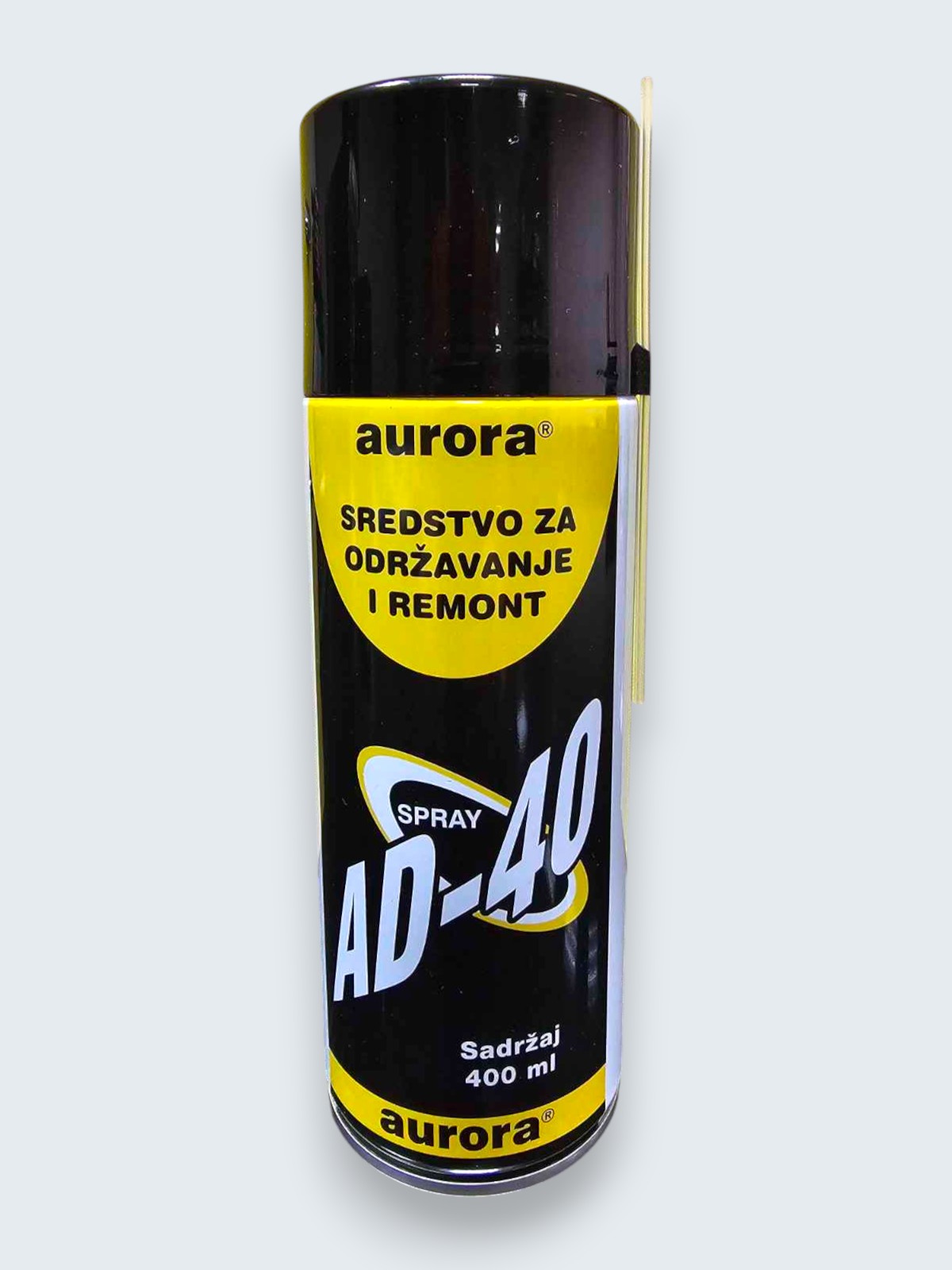 AD–40 je univerzalni sprej koji se koristi za mašinsku montažu i demontažu, kao antikoroziv, za podmazivanje obrtnih sklopova, za istiskivanje vlage.