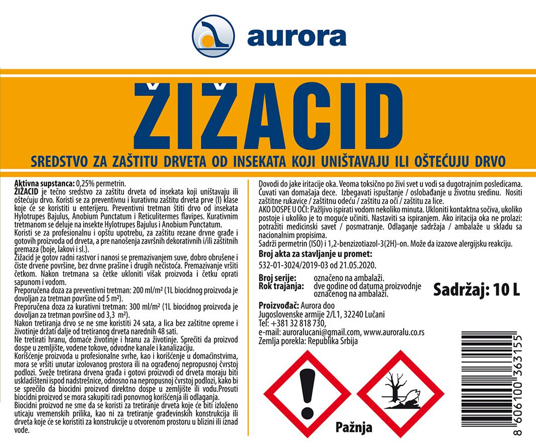 Žižacid je tečno sredstvo za zaštitu drveta od insekata koji uništavaju ili oštećuju drvo. Koristi se za preventivnu ili kurativnu zaštitu drveta prve (I) klase koje će se koristiti u enterijeru. Preventivni tretman štiti drvo od insekata Hylotrupes Bajulus, Anobium Punctatum i Reticulitermes flavipes. Kurativnim tretmanom se deluje na insekte Hylotrupes Bajulus i Anobium Punctatum.